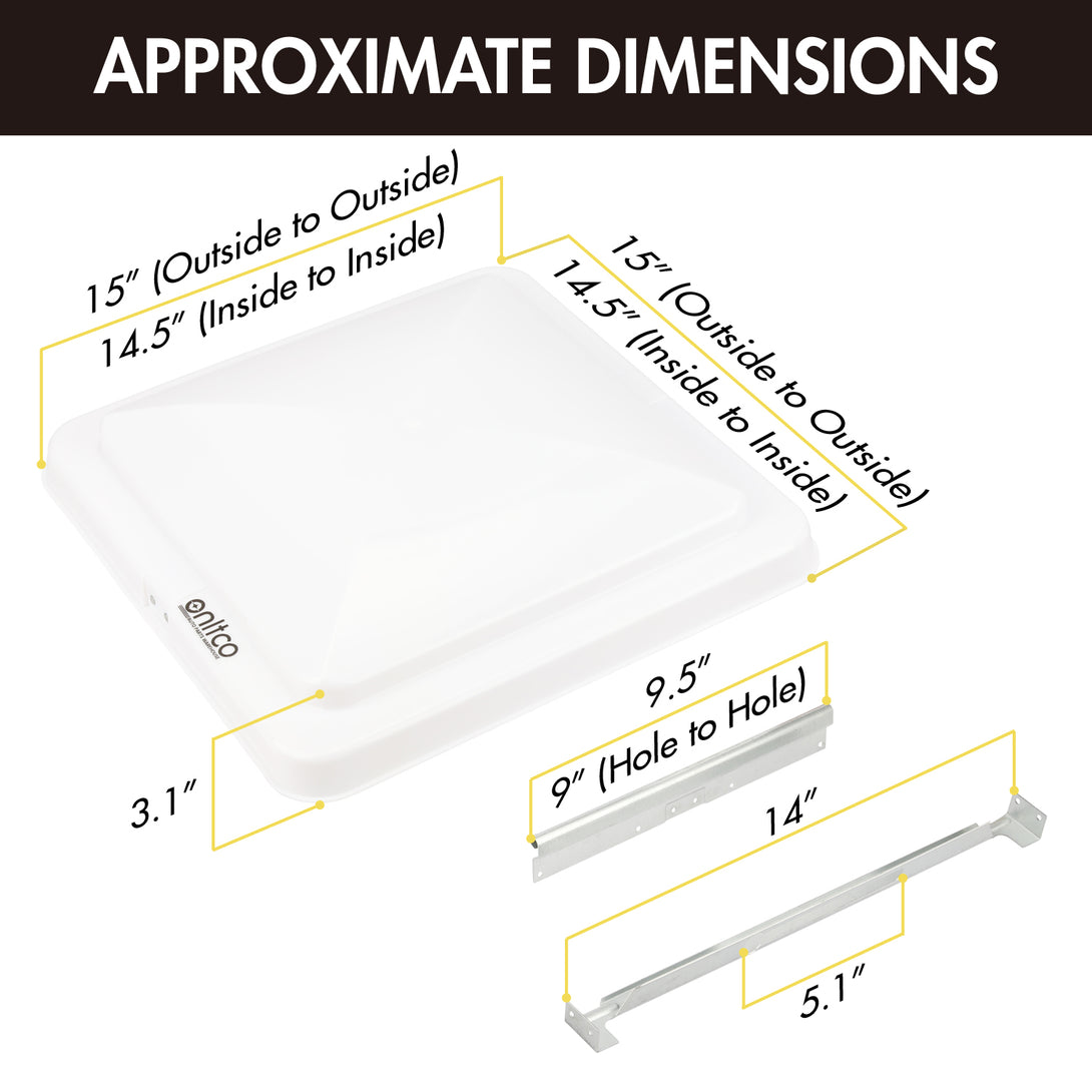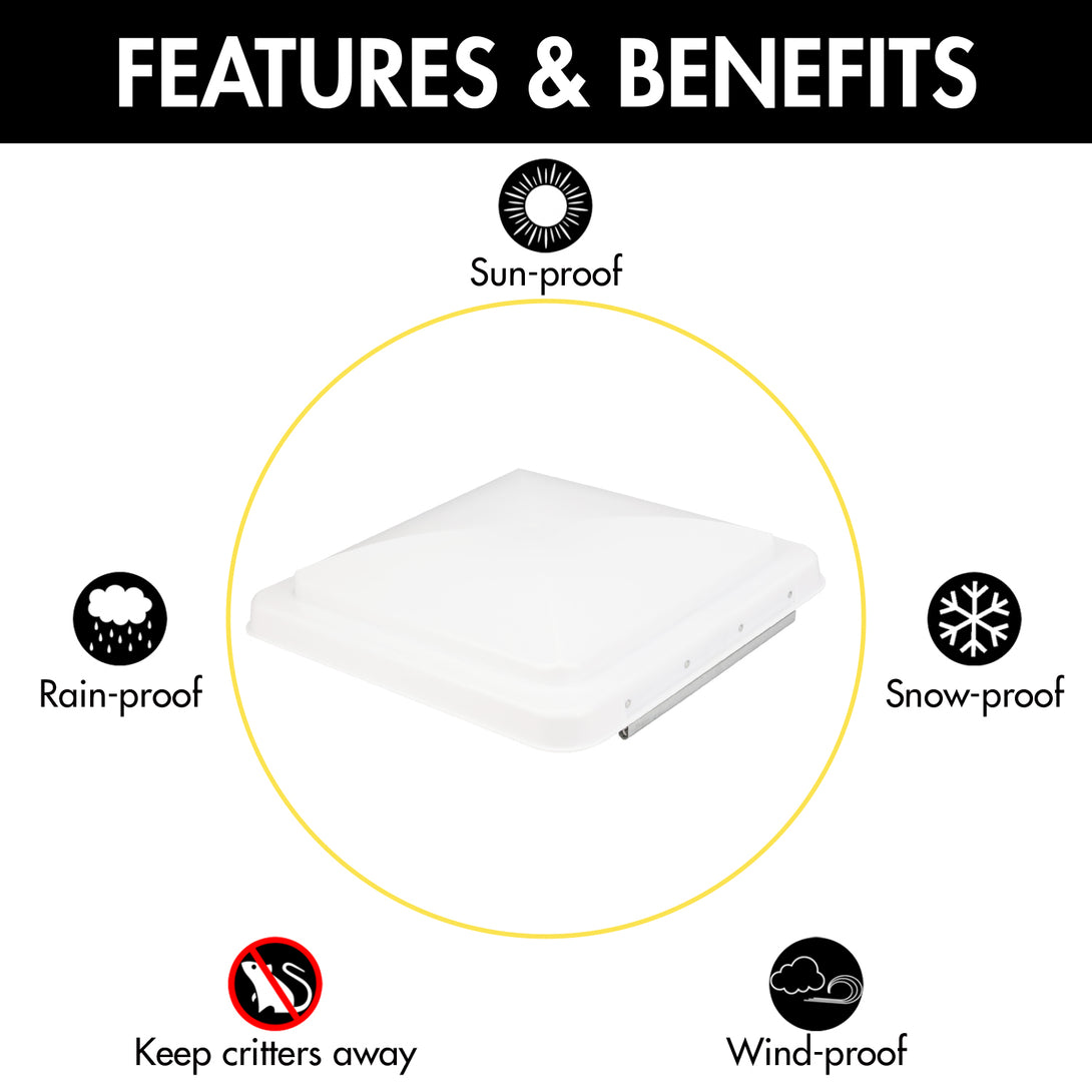 1. USE FOR: This RV vent cover is meant to replacement that fit 14"x 14" RV roof ceiling attic dome exhausts vent and comes completely assembled, which is easy to install. We understand that it’s quite inconvenient to getting on your RV roof. 14 inch RV vent covers keep RV bathroom vent air fresh, insulated rain leaking, and prevent heat entering inside RV. It suits for Camper, Motorhome, Trailer.
