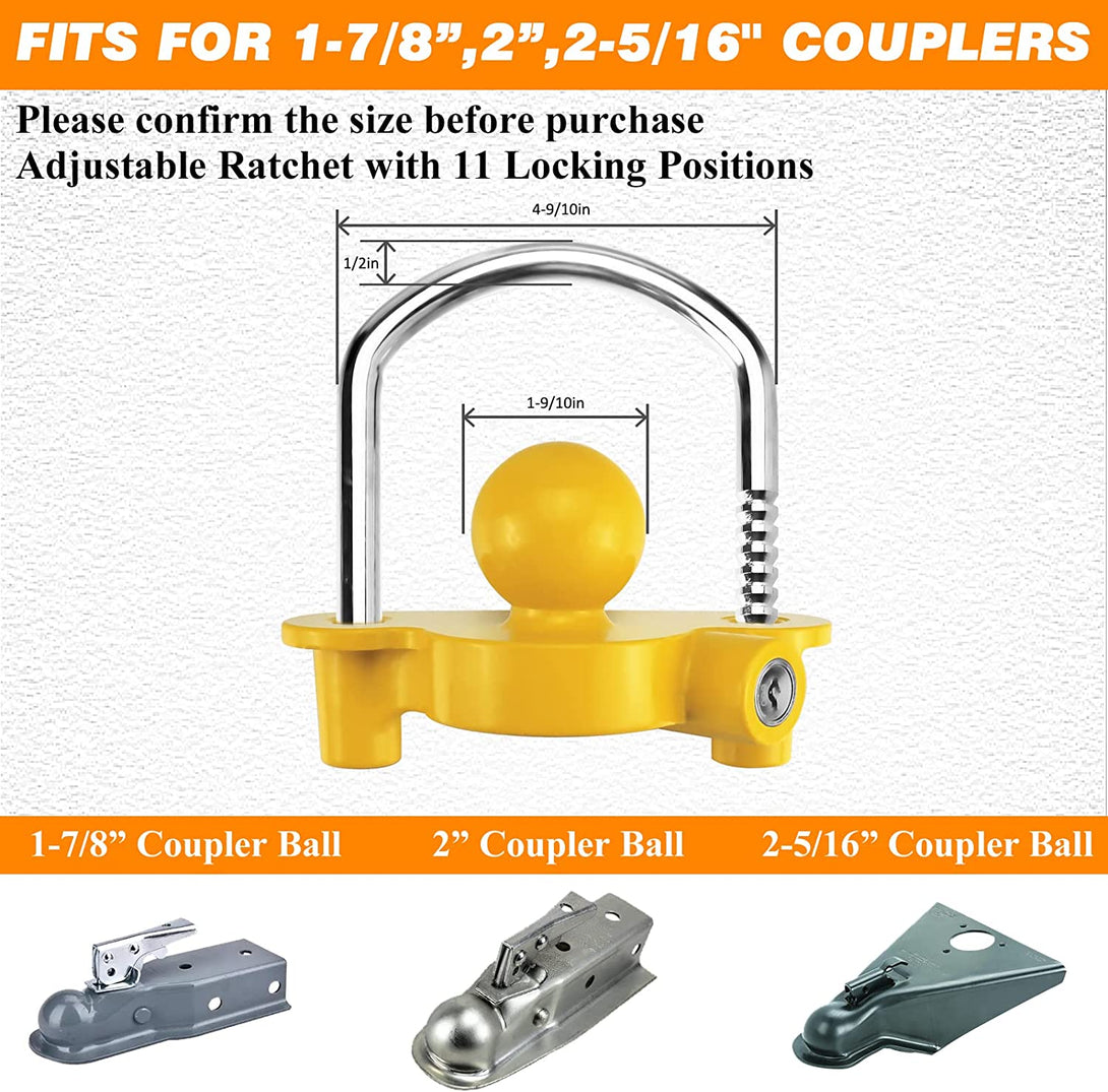 Universal Fit: This coupler lock adjusts to fit most trailers, RVs, and boats, offering widespread compatibility and convenience.